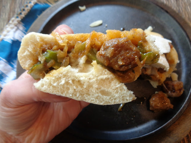 It's always been one of my favorite things to eat, reminding me of home. Problem is, a whole sausage is rather time consuming to cook and the sandwich can take a bit of time. However, this version is made with loose sausage and is therefore much quicker to make. Ten minutes tops and you can have a very flavorful and delicious version of a sausage and pepper hoagie with onions.