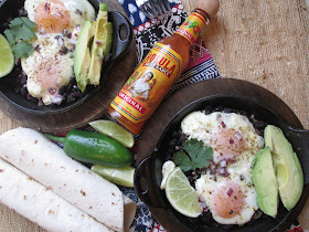Now, believe me, I use the term "inspiration" loosely. My inspiration comes in the form of being lazy. So there I am standing over the black beans in my cast iron pan and I'm thinking...I do not want to get out another pan and mess with the fussy poaching of these eggs SO...what can I do to get around that? A simple glance over at my cast iron casserole dishes gave me the answer. Bake it!